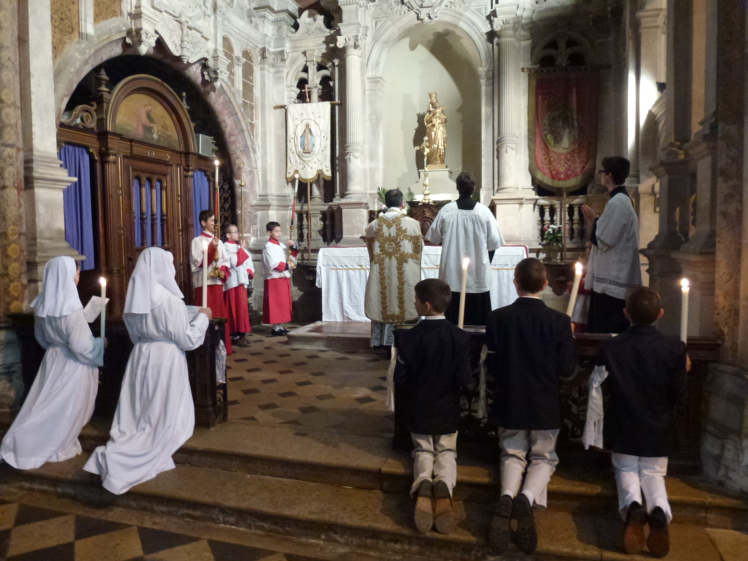 Très Sainte Vierge Marie, mère de Dieu et notre mère, souveraine des anges et des hommes, nous sommes vos enfants et nous avons reçu, ce matin, solennellement, le corps, le sang, l’âme et la divinité de votre divin fils. Nous avons proclamé notre foi en Lui et en Son Eglise. Nous venons vous dire notre filiale affection et réclamer votre maternelle protection.